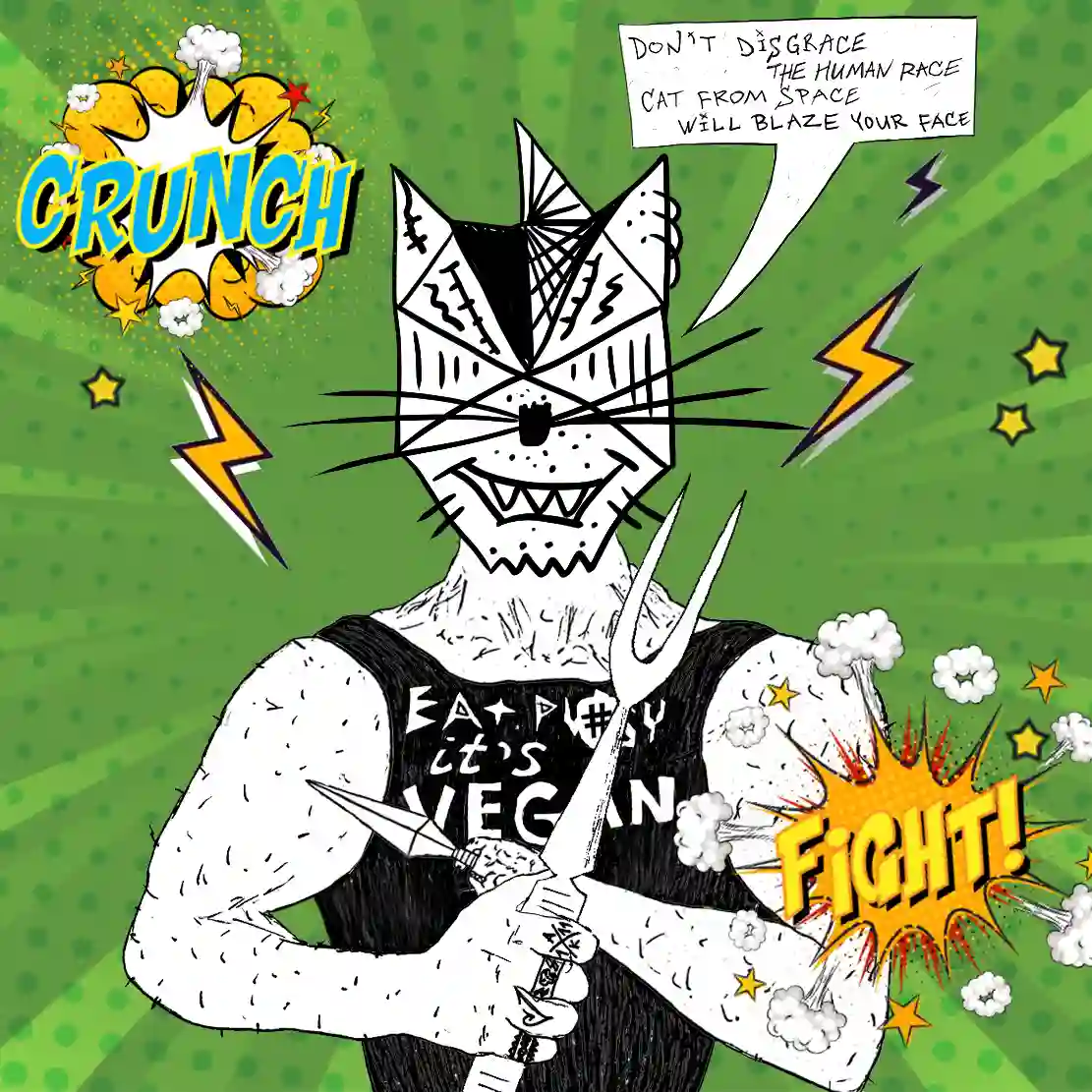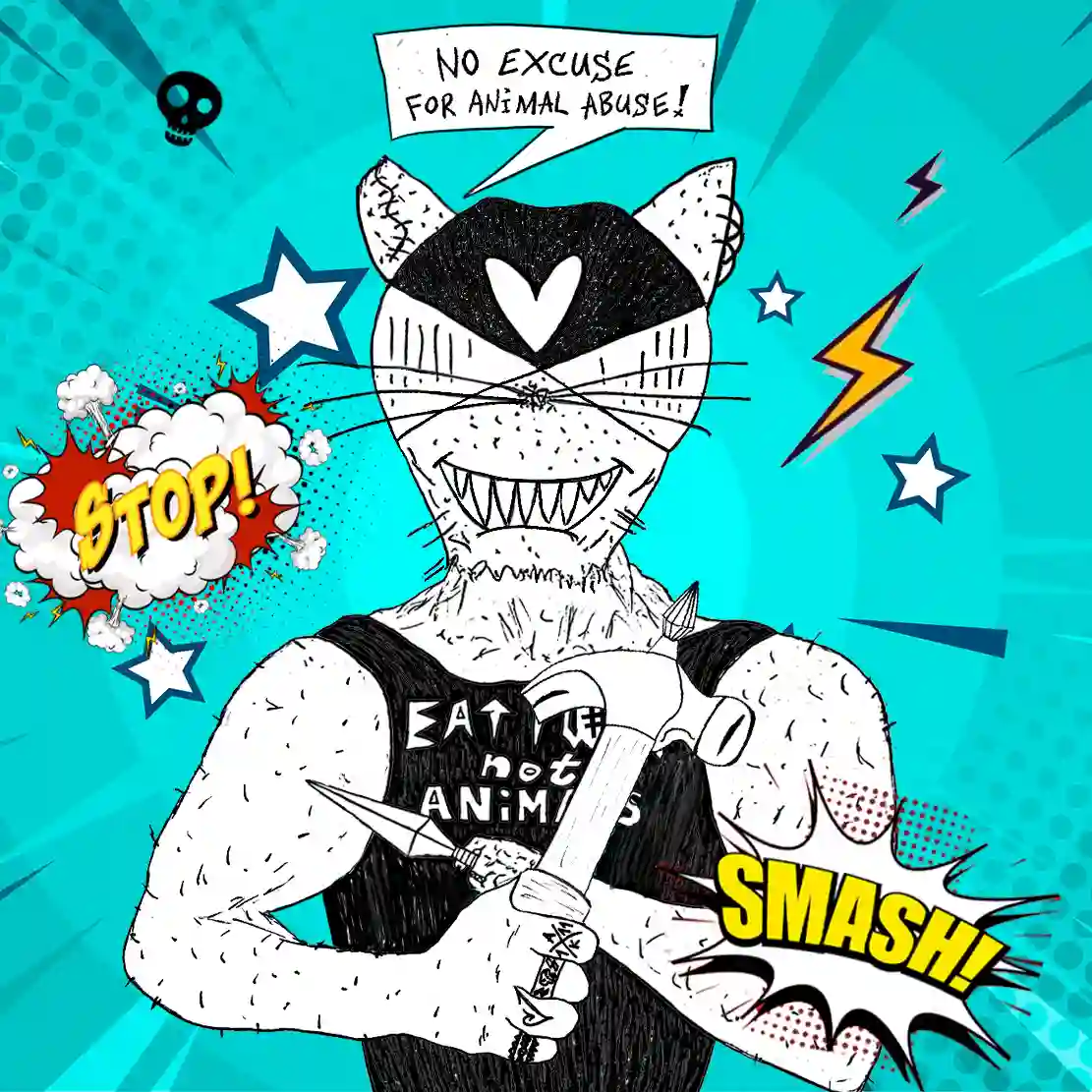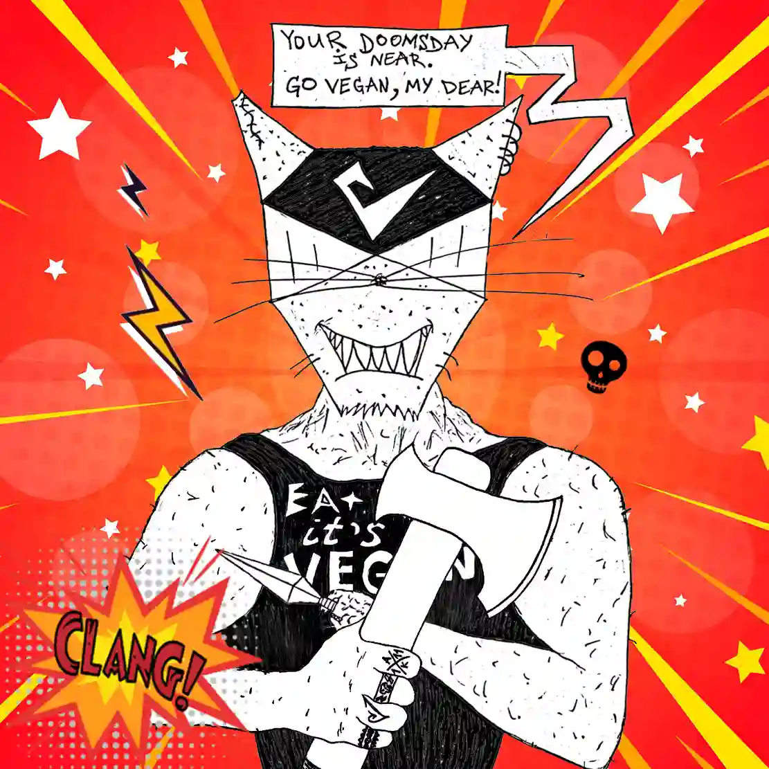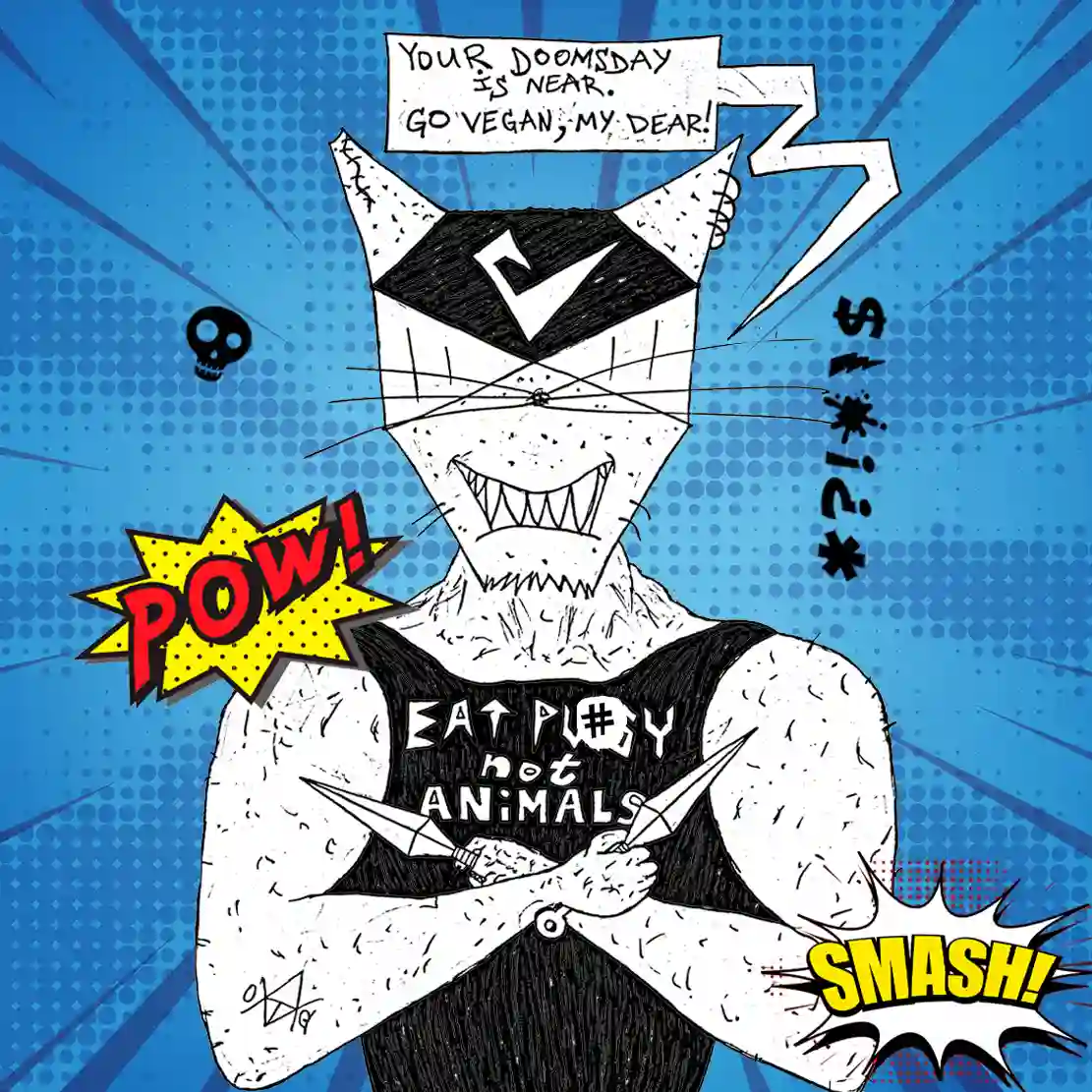 Recruited by the SuperCat civilization for a very special mission, he teleported to Planet Earth from his combat spacecraft to defeat an infamous animal abuser. While meeting human beings on his trip across the planet, he plunged into their lifestyle and quickly realized how mean most of them were towards animals. That’s when he became even more resolute about his mission: he would not have stopped until the very last cage was empty. This is how the vegan revolution was destined to begin.