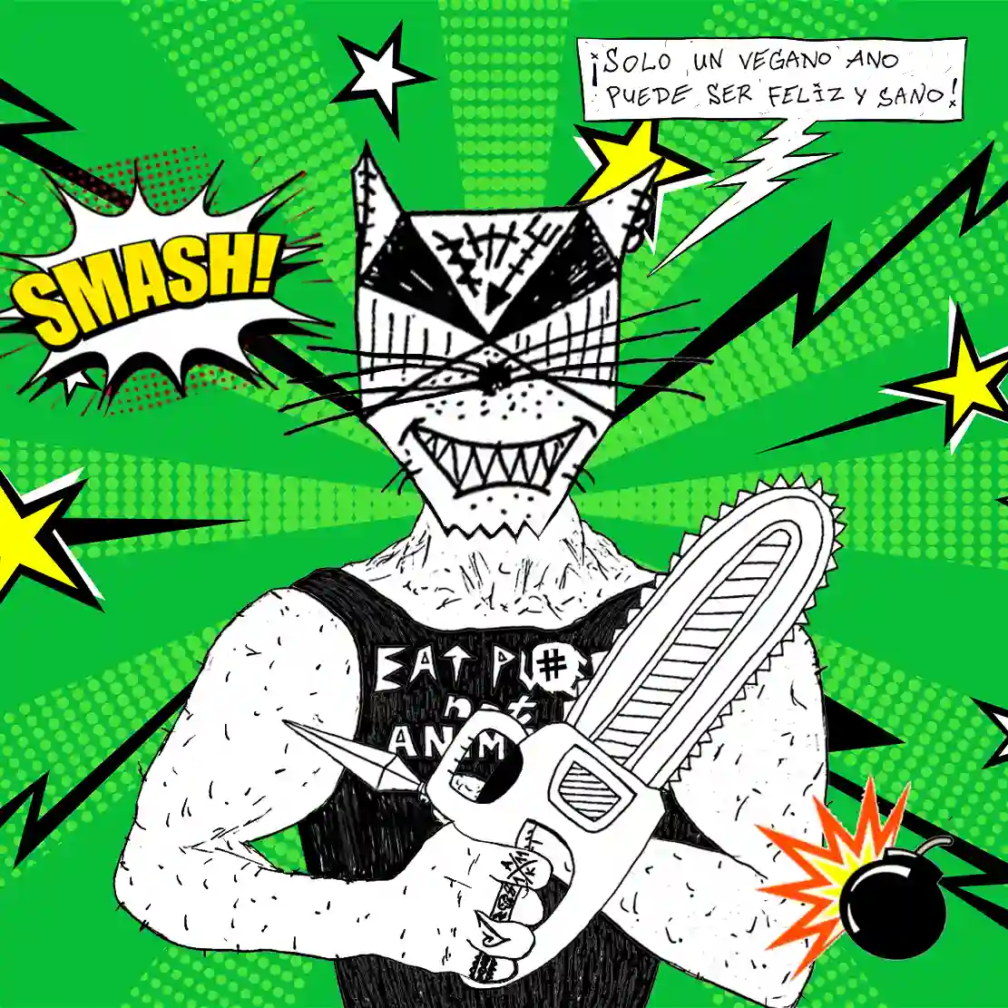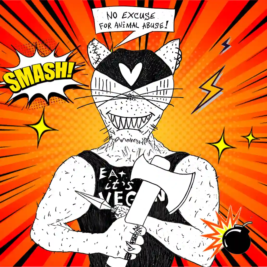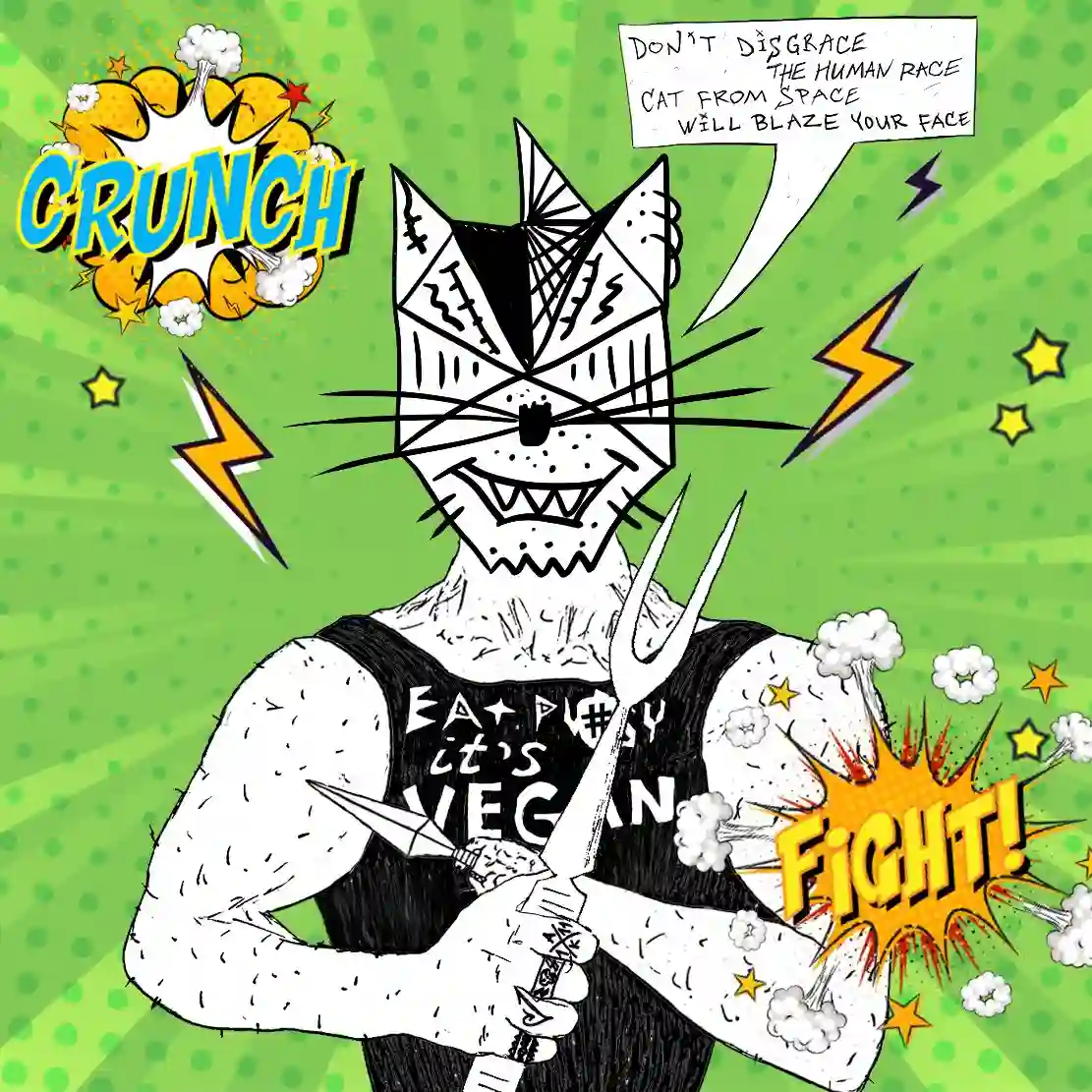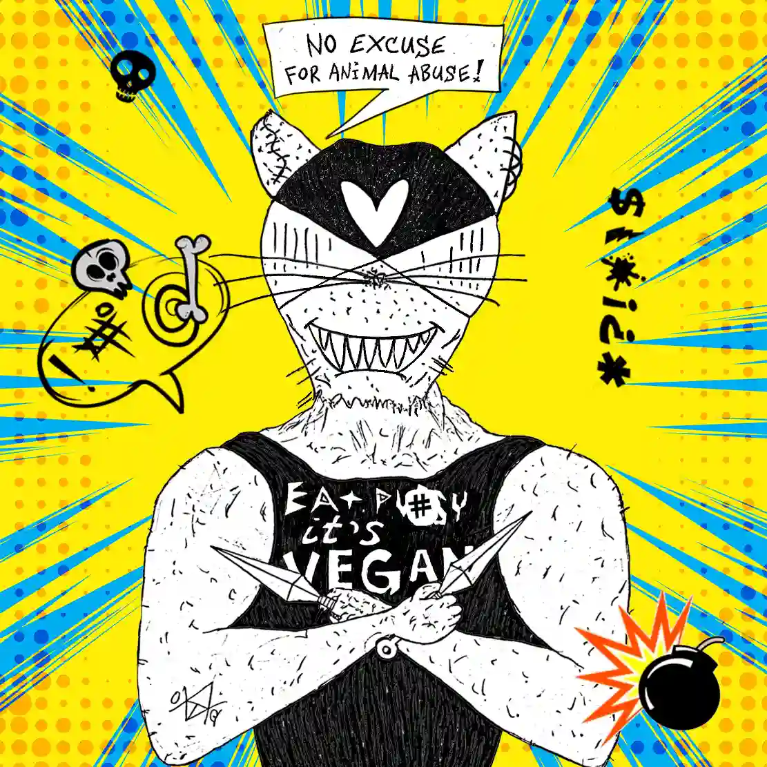 Recruited by the SuperCat civilization for a very special mission, he teleported to Planet Earth from his combat spacecraft to defeat an infamous animal abuser. While meeting human beings on his trip across the planet, he plunged into their lifestyle and quickly realized how mean most of them were towards animals. That’s when he became even more resolute about his mission: he would not have stopped until the very last cage was empty. This is how the vegan revolution was destined to begin.